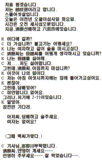 チグム(今)キヨハラソンベ(清原先輩)ハゴ(と)ロッポンギエ(六本木に)イッスムニダ(います)。
