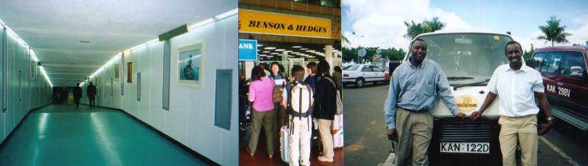 (中)ケニア到着で、やっと一息のツア−ご一行さま (右)現地ツア−会社のスタッフ