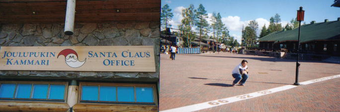 (左:サンタさんの事務所 右:白い線から向こうが北極圏。線を越えると、急に凍えがきた)
